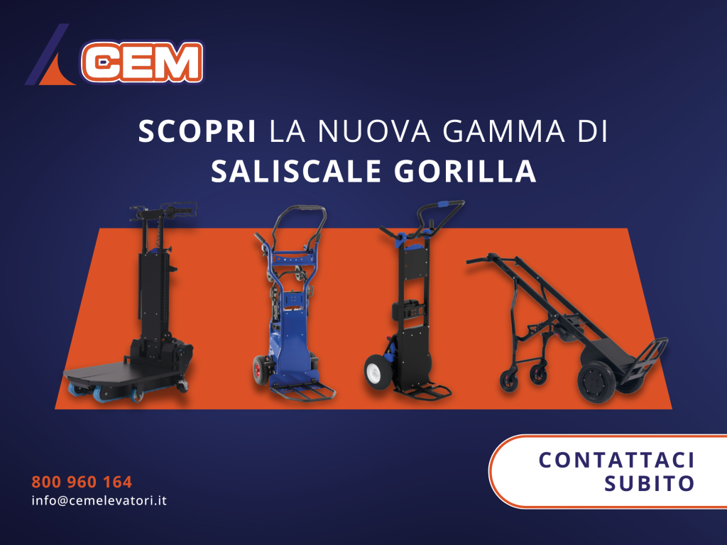 • Gorilla Easy: è un saliscale elettrico di nuova generazione, ideale per trasportare carichi fino a 150 chilogrammi su vari tipi di scale. È stato ottimizzato per ridurre dimensioni e peso, rimanendo sotto i 30 chilogrammi e consente di scendere le scale a vuoto senza l’uso del motore, migliorando l’efficienza. È adatto ad ambienti interni civili, commerciali e industriali leggeri. Il sistema innovativo di riconoscimento dei gradini elimina il blocco automatico delle ruote. La pedana elevabile consente di alzare i carichi a varie altezze con facilità, garantendo un trasporto sicuro e stabile.