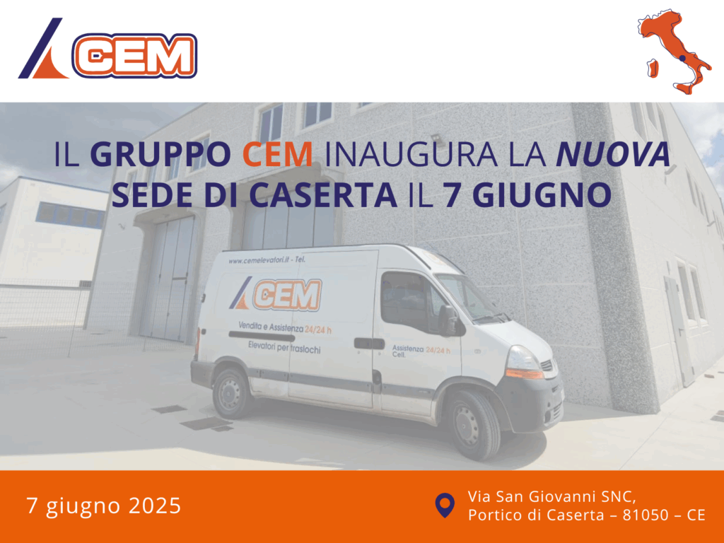 Il 7 giugno, il Gruppo CEM inaugura la sua nuova sede a Caserta, ampliando la rete di assistenza e vendita nel settore degli elevatori per edilizia e traslochi. Un centro innovativo, pensato per rafforzare il network di assistenza e vendita e per offrire supporto completo ai professionisti del settore con servizi specializzati e una vasta gamma di prodotti.
