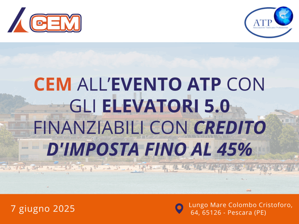 Il 7 giugno, il Gruppo CEM sarà presente all’ATP, Associazione Traslocatori Professionisti di Pescara, un evento di riferimento per il settore dei trasporti e del sollevamento professionale. La partecipazione avrà un focus ben definito: presentare una soluzione strategica per il futuro delle imprese, la formula di finanziamento 5.0, che offre un vantaggio competitivo senza precedenti.